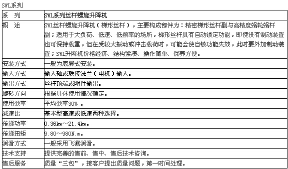 SWL系列蝸輪絲桿升降機(jī)是一種基礎(chǔ)起重部件,符合JB/T8809—1998(原JB/ZQ4391—86)標(biāo)準(zhǔn)。該產(chǎn)品可廣泛用于機(jī)械、冶金、建筑、化工、醫(yī)療、文化衛(wèi)生等各個行業(yè)。承載能力2.5—120T。具有結(jié)構(gòu)緊湊、體積小、重量輕、動力源廣泛、噪音小、安裝方便、使用靈活、功能多、配套形式多、可靠性高、使用壽命長等優(yōu)點(diǎn)。具有提升、降落、推進(jìn)、翻轉(zhuǎn)等功能,可以單臺或組合使用。能按一定程序準(zhǔn)確地控制調(diào)整提升或推進(jìn)的高度,可以用電動機(jī)或其它動力直接帶動,也可以手動。最高輸入轉(zhuǎn)速1500r/min,最大提升速度2.7m/min。有不同的結(jié)構(gòu)型式和裝配方式,提升高度按用戶的要求制造。該裝置可以自鎖。