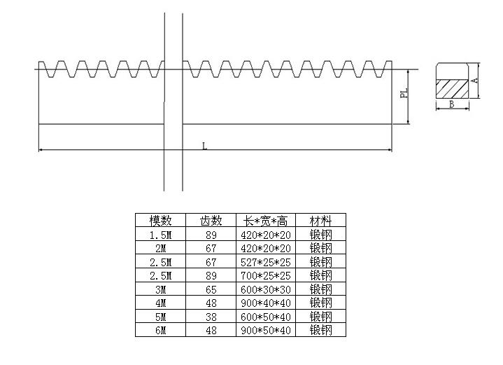 齒條也分直齒齒條和斜齒齒條,分別與直齒圓柱齒輪和斜齒圓柱齒輪配對使用; 齒條的齒廓為直線而非漸開線(對齒面而言則為平面),相當于分度圓半徑為無窮大圓柱齒輪。根據(jù)客戶需要,提供齒條的調(diào)質(zhì)、齒面淬火、發(fā)藍(煮黑)等加工服務。本產(chǎn)品廣泛應用于眾多機械設備上。