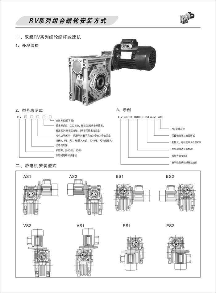 RV雙級蝸輪蝸桿減速機外觀圖、型號表示方法、安裝方式