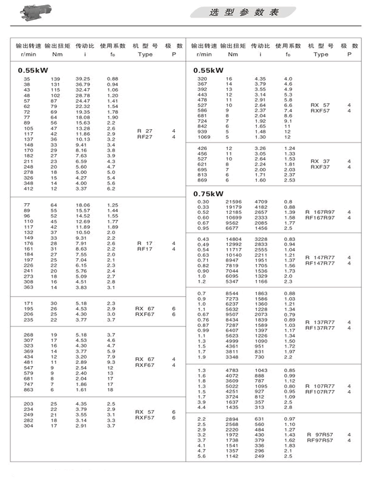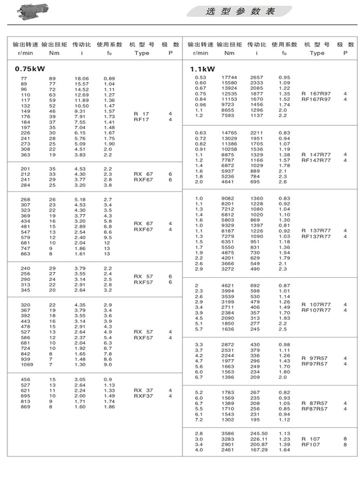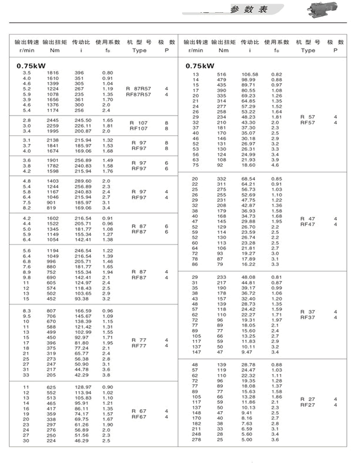 R斜齒輪減速機(jī)選型參數(shù)表0.75KW