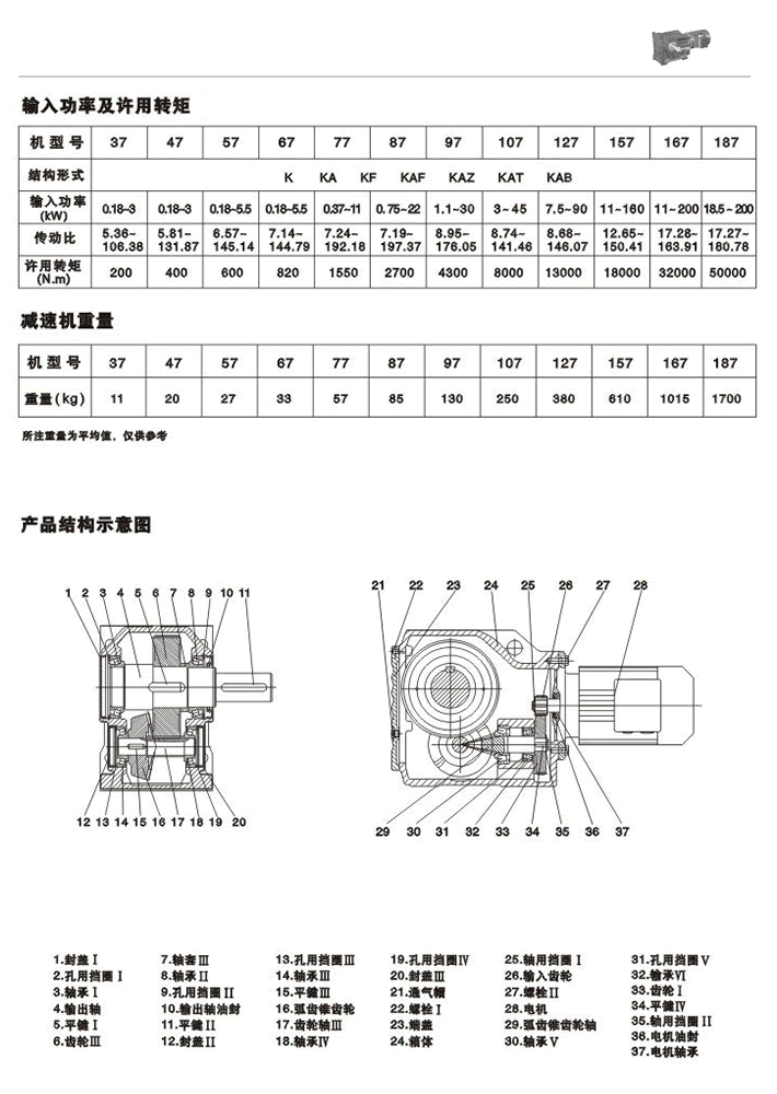 K螺旋錐齒輪減速機輸入功率及許用轉(zhuǎn)矩、減速機重量、產(chǎn)品內(nèi)部結(jié)構(gòu)示意圖